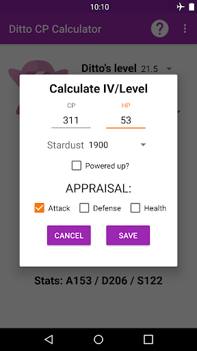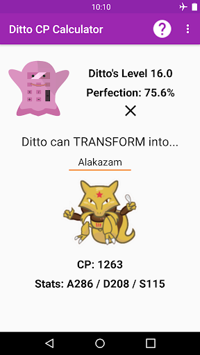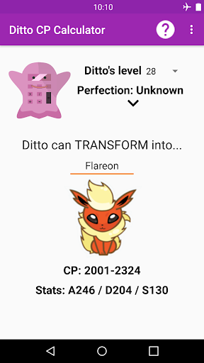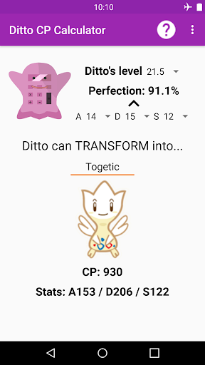 With this app, you can calculate the level and perfection of your Ditto to find out the CP it will have when he transforms into the enemy Pokemon. Also you will see the stats he adopts when it's transformed.