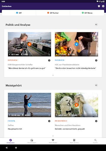 - Themenbereich “Entdecken”: Lassen Sie sich von unseren Redakteuren inspirieren – wir stellen Ihnen einen bunten Mix aus unseren Programmen Deutschlandfunk, Dlf Kultur und Dlf Nova zusammen: News und Debatten zu aktuellen Themen aus Politik, Gesellschaft und Wirtschaft inklusive Analysen und Interviews. Darüber hinaus haben wir für Sie Geschichts- und Wissenschafts-Beiträge, Achtsamkeits-Podcasts sowie eine Übersicht der beliebtesten Podcasts und Hörspiele - übersichtlich dargestellt mit Kurzinformationen zu den Beiträgen inklusive Zeitangaben