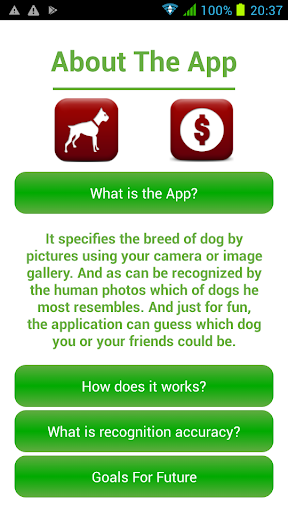It specifies the breed of dog by pictures using your device's camera or image gallery. And as can be recognized by the human photos which of dogs he most resembles. And just for fun, the application can guess which dog you or your friends could be.