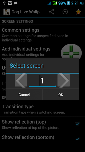 Common settings: - Select picture source to display pictures (picture source can be internal wallpaper present in live wallpapers app, or select from album or picture folder or even select a single picture). Change the background color of the screen (it can be red, green, blue etc. or auto detect color), crop or resize pictures to fit screen size or fit to full screen, decrease image saturation (from 100 to 10 %), or decrease opacity of the image.