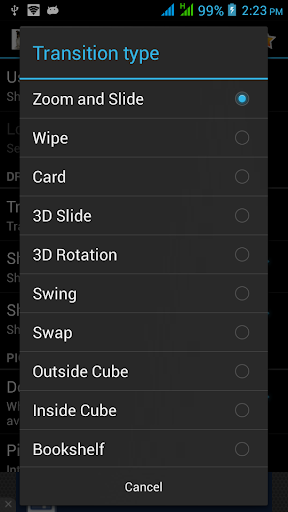 Transition type settings: - When switching screen you can change its animation to 3d, swing, wipe, etc. etc. zoom and slide is automatically selected.