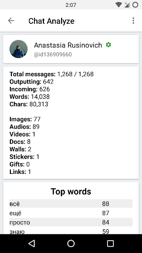 - complete analysis of your conversations. Shows the total number of messages, words, symbols. list of active members in the conversation and frequently used words.
