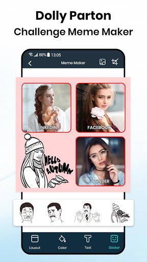 Dolly Parton Challenge Maker simple — the country queen herself was the person who invented the meme and posted it first. Her original post on Jan. 21 features four different pictures of her stacked in a 2x2 frame. The first picture, labeled LinkedIn, features Parton in a checkered blazer and ruffled necktie. The second is a smiling picture of Parton in a turtleneck Christmas sweater, with the frame labeled "Facebook." On the bottom row, the left picture says Instagram and shows a black and white picture of the singer with her leg extended and a guitar by her side.