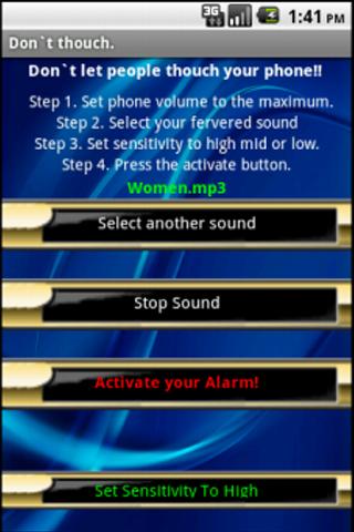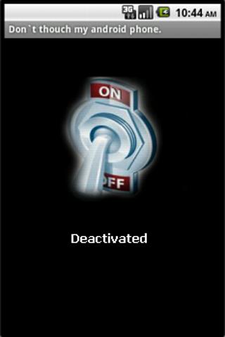 Dont touch liteDon39;t Dare Touch My android Phone LiteAntitheft for your android phone. Scare anyone touches your Android device phone without your permission had someone pick it up without you knowing? Now you39;ll know, right away.This android app can be saved to your sdcard.Very sensitive motion detector.Step 1. Please ensure your phone ringer volume is set to maximum before you activate the device phone Step 2. Select your fevered sound Step 3. Set sensitivity to high med or low.Step 4. Press the Activate button.In the full version 13 different high quality sound to choose from, whenever your phone is moved. police siren1, police siren2, Attention, Luchtalarm, Mexican, Women, Somethingwrong, Acces denied, Dog, Man Scream,Red alert, and more