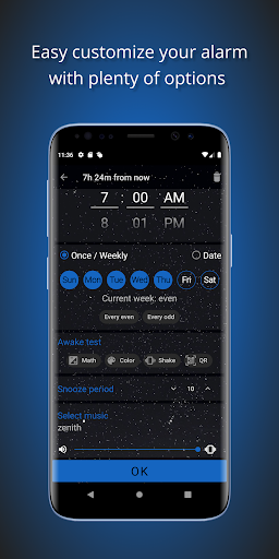 Flexible time settings will help you to set alarm clock on the day of week (“odd/even week” option is supported) or specific dates. There is also an option to quickly set up a non-repeatable one time alarm.