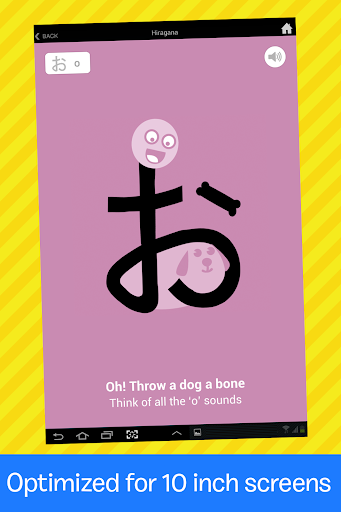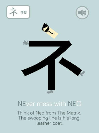 Each screen presents a Japanese Kana character along with a mnemonic clue. Read the clue, listen to the clip and move on to the next one.