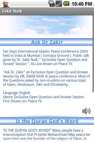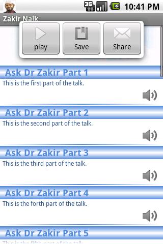 Assalamu Alaikum wa rahmatullahThis is an unofficial zakir naik app. It lists talks of zakir naik which can be streamed, saved or shared. New talks will be made available regularly insha allah.About Dr Zakir Naik A medical doctor by professional training Dr. Zakir Naik is renowed as a dynamic international orator on Islam and Comparative Religion. Dr. Zakir Naik clarifies Islamic viewpoints and clears misconceptions about Islam, using the Qur'an, authentic Hadith and other religious Scriptures as a basis, in conjunction with reason, logic and scientific facts.Dr. Zakir is popular for his critical analysis and convincing answers to challenging questions posed by audiences after his public talks. In the last 12 years (by the year 2008), Dr. Zakir Naik has delivered mo re than 1200 public talks in the U.S.A., Canada, U.K., Saudi Arabia, U.A.E., Kuwait, Qatar, Bahrain, Oman, South Africa, Italy, Mauritius, Australia, Malaysia, Singapore, Hongkong, Thailand, Guyana (South America), Trinidad and many other countries, in addition to numerous public talks in india Recent changes:1) server change2) performance fixes3) download progress in notificationcontent rating: Everyone