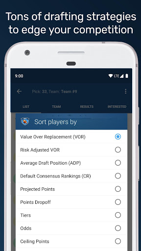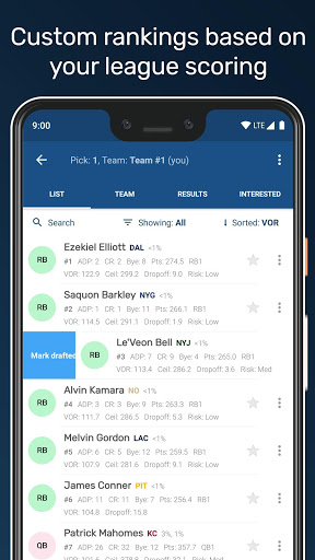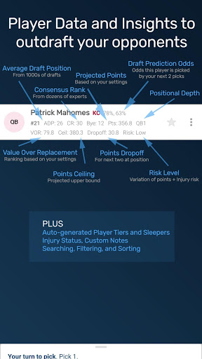 * Dynamic insights as you start drafting players like team needs, recommended picks, points dropoff, and percentages that a player will be available next time you need to draft.