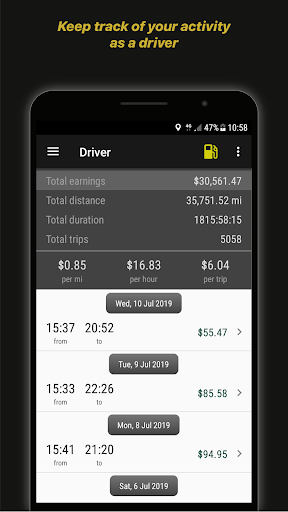 Being a rideshare driver, how much do you earn per hour worked? How many trips do you make each day? What is the average gain for each trip? Using Driver Earnings you will track all the numbers that interest you.