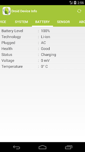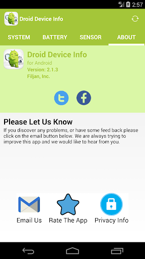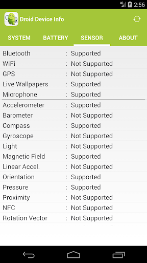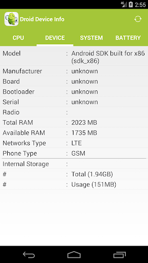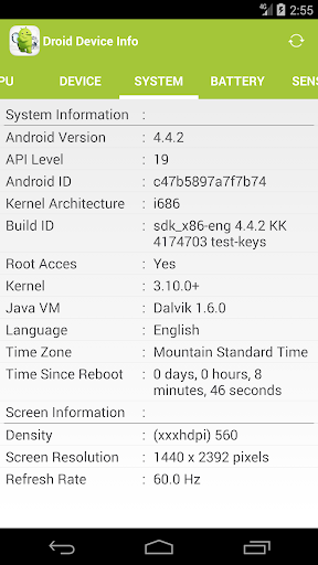 Droid Device Info shows detailed information about your Android smartphone and tablet including device hardware, system status, memory, camera, battery and sensor details.