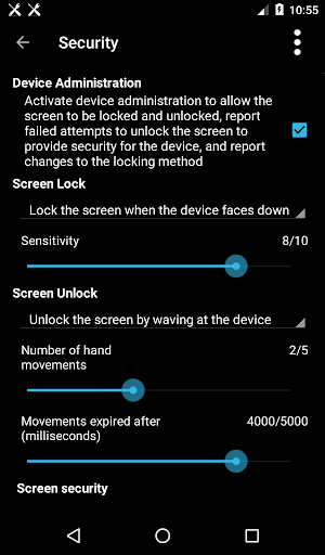 - Lock the screen by waving at the device, shaking the device, turning the device downward, or manually.