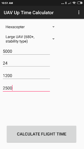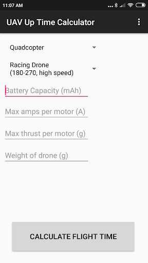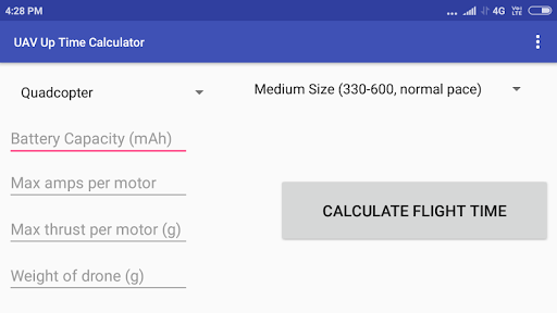 This app helps (prospective) drone pilots know how long their UAV will be in the air, based on the specifications of their build. This app is light, simple, and easy to use.