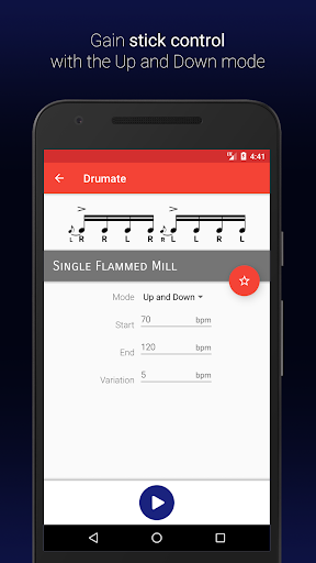 Drumate lets you take advantage of the processing power in your phone to generate a vast amount of training patterns from a single rudiment. This makes it a lightweight and efficient app, since it needs very little storage space, and it allows you to experiment with three practice modes: