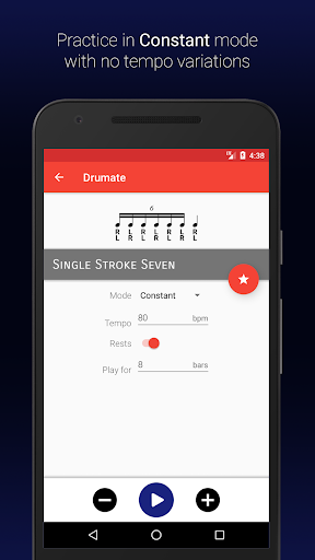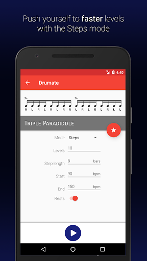 The app currently uses Android's internal synthesizer for playback, but with your appreciated help and contribution when installing Drumate Free or purchasing the Premium version, I will be able to buy a software license for better snare and metronome sounds. Your help will also allow me to continue working as an independent developer to make it better, listen to your opinions and update it.