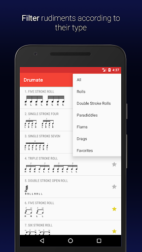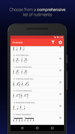 The rudiments can be filtered by type, and you can mark rudiments as Favorites so you can filter them and focus on sets of rudiments. It is a great tool for musicians, specially drummers and percussionists. Drumate is the true mate to improve your drumming!