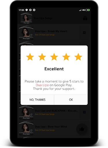 Dua Lipa Lovers, Let us know of what you think about our App in the reviews and what could be improved for your Top Dua Lipa Songs Application and If you like my app, please rate us 5 stars and leave a nice comment, thank you so much Injoy it !
