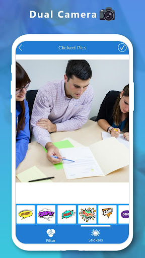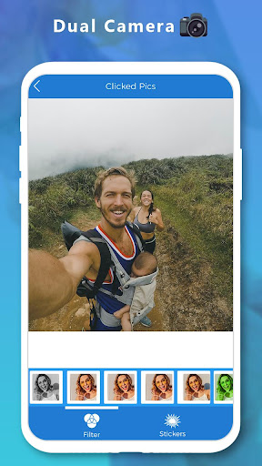 Taking photos with Dual camera is a new way to capture photos and share it on social networks. You can also take a picture in Dual Camera just by whistling. This is only one possible function provided by Dual Camera. In addition you can merge the pictures of both cameras horizontal, vertical or you overlay them. Apply Cool Filter Effects or add some funny stickers. And then you can share the result via Facebook, twitter, Instagram, email etc. with your friends.