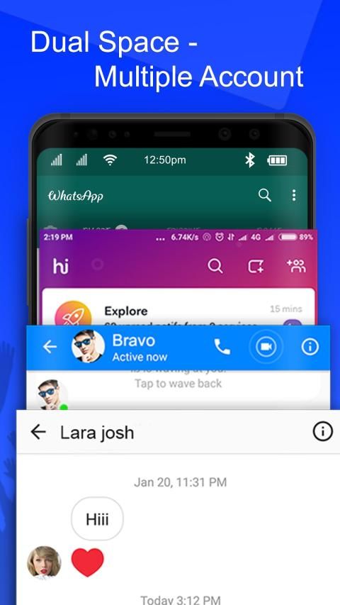 Dual Space 2019 - Clone Apps (Multiple Accounts) will help to handle two girlfriends at same time with multiple account of same social media application. Dual Space 2019 - Multiple Accounts will help to handle two boyfriends at same time with multiple account of same social media application like hike ,etc.