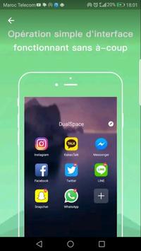 · Dual Space est une technologie de pointe qui peut cloner des applications. Nous n'installons pas plus d'applications dans votre téléphone, afin que votre téléphone