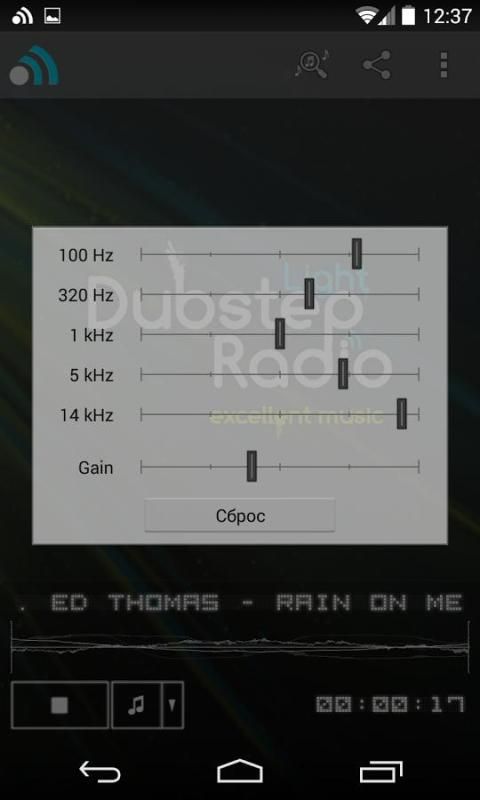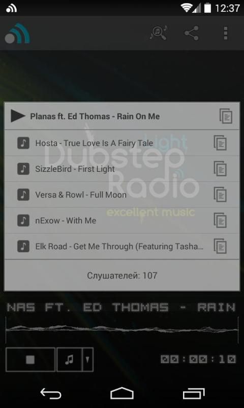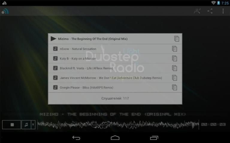 The application lets you listen to Dubstep Light Radio - project created by people with similar musical tastes. This is the only online radio broadcasts a huge number of quality tracks in styles Dubstep Light (light, melodious, calm dubstep), Chillstep, Downtempo, as well as some similarities with them and mixed.