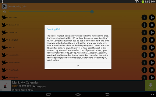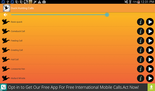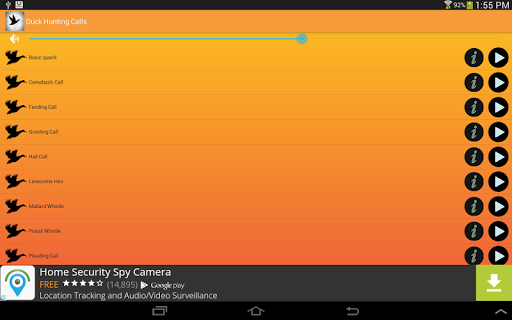 You can use this app as hunting whistle for attracting ducks towards your gun. Application provides real electronic calls for duck hunting. This application helps you to improve your hunting skills in all seasons. App also provides a lot of information regarding the selected type of duck call. Pretty simple and easy user interface with no extra searching but just click on play button and start your call with this life-like real calls application.