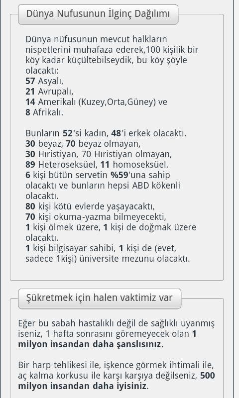 Şuanda dünyada kaç kişiyiz merak ediyor musunuz ? Bu sorunun ve ilginizi çekecek bir çok ilginç veriler bu uygulamada sizleri bekliyor. Küresel ısınma sizce ne durumda ? Ne kadar petrol stoğumuz kaldı dersiniz ? Ya doğalgaz ? Aids virüsü ne kadar hızlı yayılıyor öğrenmek ister misiniz ? Peki nelere sahibizde farkında değiliz bunlarıda öğrenmek ister misiniz ? Hepsi ve daha fazlası Dünya Nufusu uygulamasında sizleri bekliyor. keywords: dunya nufusu,dünya nüfusu, world population, world counter,