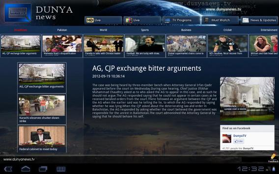 Experience what happens when news meets the latest technology with the new official DUNYA TV App for Android Tablets a smarter, sleeker way to experience a world of news and insights. DUNYA TV is the leading News Channel for Pakistan and the world.