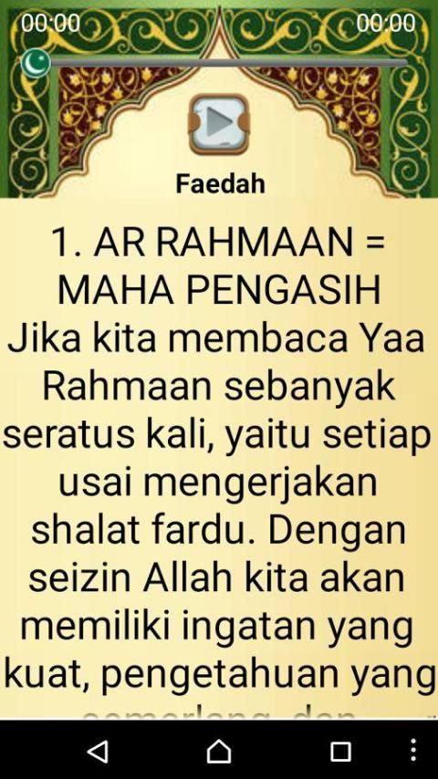 In addition to containing the devotions and prayers morning and evening, this application also contains 99 names of Allah Divine Name equipped with audio Mp3, Arabic, Latin, Indonesian as well as the meaning, significance and efficacy benefits of dhikr of the Divine Name