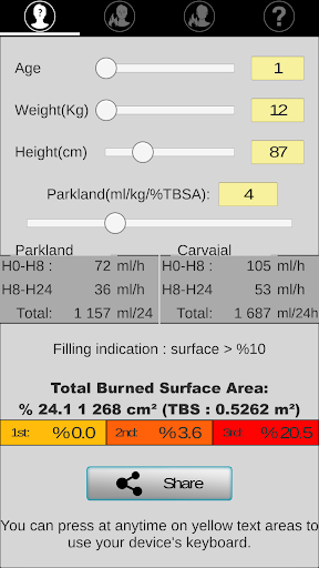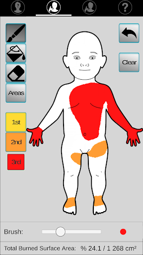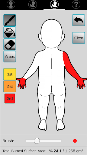 Application aimed at guiding initial fluid management (adults and children) after drawing the burned surface on a template (Lund and Browder chart).
