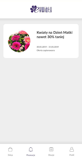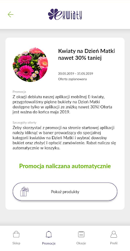 aplikasi e-flower antara lainMemfasilitasi pesanan dengan cepat, memberikan akses ke penawaran khusus hanya untuk penggunanya, dan juga menginformasikan tentang acara-acara mendatang.Segera, opsi berguna lebih lanjut akan ditambahkan ke aplikasi.