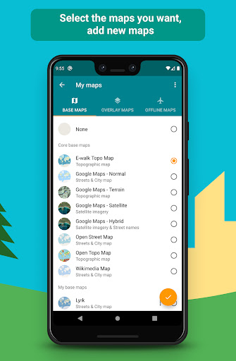 • download maps for later offline use (free for OpenStreetMap and Wikimedia Maps, with subscription for E-walk Topo Map)