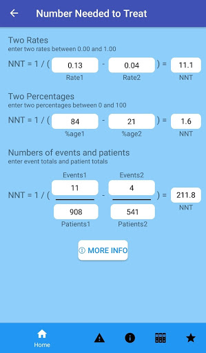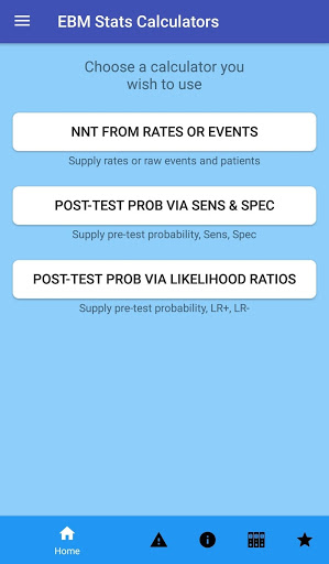 Occasionally in medicine, we really need to "do the math". This app will help. EBM Stats Calc let's a clinician do calculations that are hard or impossible to do in one's head. A clinician can get NNT's (number needed to treat) from rates, percentages, or raw event and patient numbers. And a clinician can use sensitivity and specificity or likelihood ratios (LR+, LR-) to go from a pretest probability to posttest probability and positive predictive value and negative predictive value.