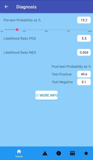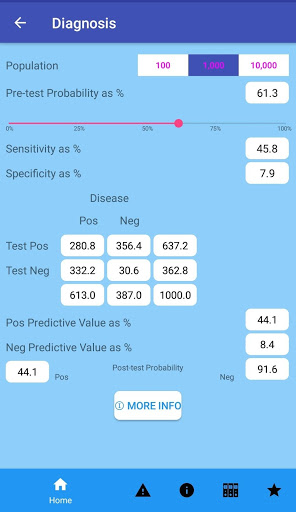 Although these calculators themselves are somewhat novel for apps, the unique tool in this app is for educators. Students and residents have a hard time understanding how the utility of a test can vary with pretest probability. Instead of saying it in words and hoping they get it, now you can demonstrate it. A test might perform well, giving good PPV and NPV, when pretest probability is in a certain range. But slide that pretest probability up or down and see the diagnostic utility change with the numbers flying right before your eyes. The tool also shows a student that in many cases, an imprecise estimate of pretest probability doesn't much matter. Different doctors might judge a clinical case to suggest likelihood of disease (pretest probability) of 40%, 50%, or 60%. The slider tool shows that the differences may not matter, and the test in mind will render good clarity regardless of differing opinions on pretest probability.