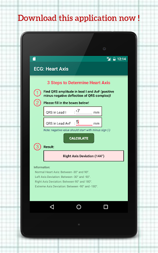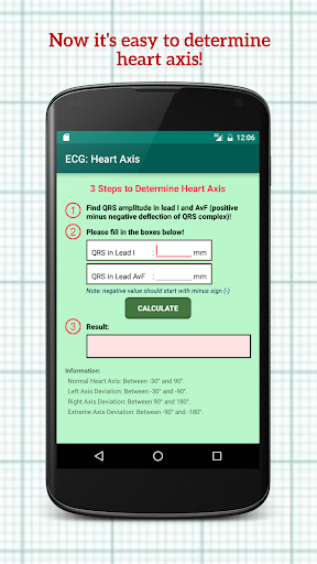 "Electrocardiogram (ECG) Rhythm App: Heart Axis" is a simple application to determine heart axis by using an electrocardiogram (ECG) reading. "Electrocardiogram (ECG) Rhythm App: Heart Axis" app is designed to help health professional in clinical practice, intensive care, or emergency department. Heart axis or cardiac axis is the direction of action potentials during ventricular depolarization. In "Electrocardiogram (ECG) Rhythm App: Heart Axis" app, you need to input the QRS complex deflection in lead I and lead AvF. The electrical heart axis will then be shown in vector degrees. The interpretation of the vector degrees result is provided. There are 4 interpretations in "Electrocardiogram (ECG) Rhythm App: Heart Axis" app, namely normal heart axis, left axis deviation (LAD), right axis deviation (RAD), and extreme axis deviation.