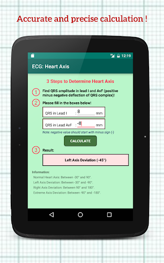 "Electrocardiogram (ECG) Rhythm App: Heart Axis" is designed for health care practitioner to determine heart axis in vector degrees from an electrocardiogram (ECG) result. The heart axis represents the major vector of ventricular activation, which is the overall direction of electrical activity. It is important to assess the heart axis of a patient with suspected heart disease.