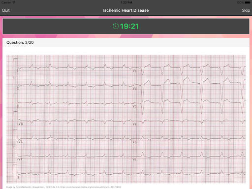 The database contains 200 ECG / EKG quiz with several topics, such as atrial and ventricular abnormalities, impulse formation abnormalities, impulse conduction abnormalities, ischemic heart disease, and other categories. All of the ECG / EKG quiz databases are available, even on the free version.