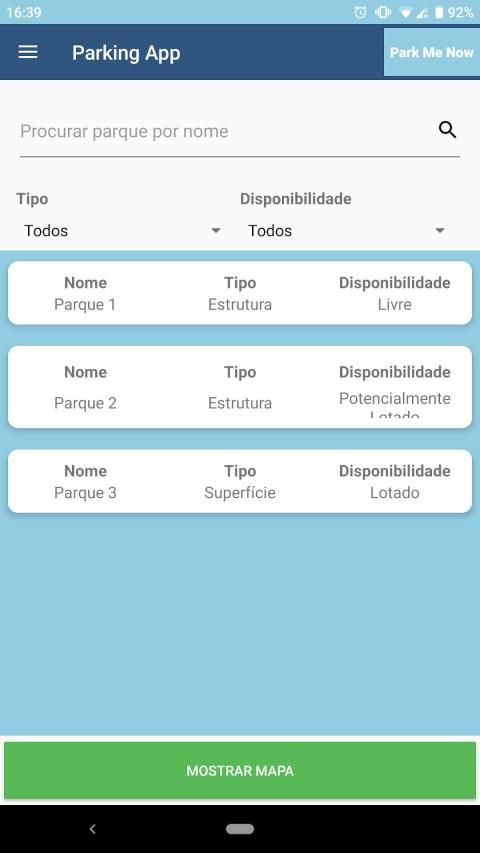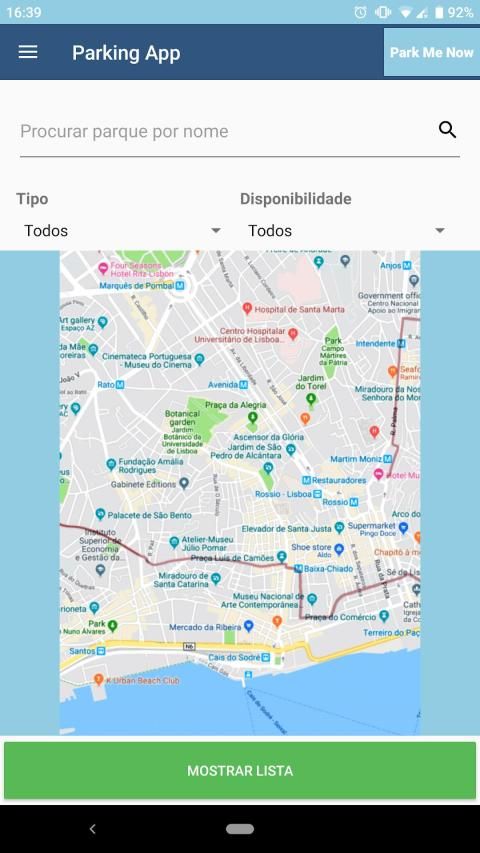 O utilizador pode pesquisar por parque de estacionamento pesquisando num ecrã de lista ou num mapa.