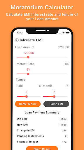 Depending on your choice, your monthly EMI, loan tenure and no. of EMIs post moratorium period will be displayed. and also show the finance impact of both cases.