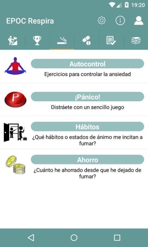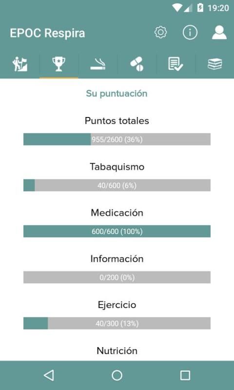 This application includes all areas of intervention in COPD patients (medication, smoking, nutrition, physical activity and knowledge of the disease) and facilitates the patient all this information in stages through scheduled notifications sent to your mobile device.