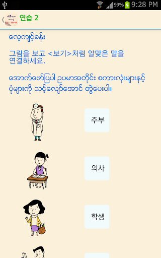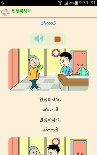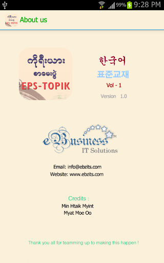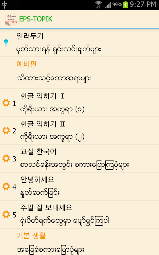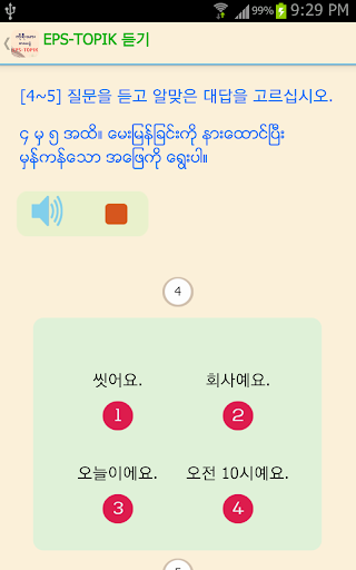 Il supporto dell'esame EP-Topik per rispondere alla Corea del Sud come lavoratore straniero.Questa app è composta da 30 camere.Parla con le stanzeil termine,Esercizio di Gramma;Mancia,Sala di allenamento praticoCulturaÈ programmato per modificare il libro originale sulla traduzione del libro originale, iniziando a leggere e ascoltarlo.Il capitolo 6 sarà disponibile gratuitamente e addebite 5.000 kyats se si desidera studiare tutte le stanze rimanenti.È possibile visualizzare la guida all'acquisto nell'app.L'app è di circa 45 MB e i file audio sono previsti per scaricarlo online utilizzando l'app.Tutte le dimensioni audio hanno circa 66 MB di dimensioni.