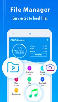 ES File Explorer (File Manager) helps you handle all your files whether they are stored in your device's memory, microSD card, local area network, and cloud storage accounts.By default, ES File Explorer (File Manager) allows you to copy, move, rename, delete or share files to and from any of your storages. It also lets you browse and access your files by category.