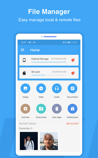 It supports every file management actions (open, search, navigate directory, copy and paste, cut, delete, rename, compress, decompress, transfer, download, bookmark, and organize). File Manager supports media files and major file formats including apk.
