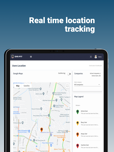 - Seamless geolocation monitoring of EVO PTT Users location.