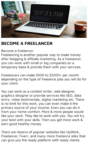 If you are looking for some extra income from your home comfort -without investment- then you definitely need to download this app. You only need a computer, High-speed internet connection, and some time to spend on the computer. Inside you will find all the best information you need to. We know that every person has his or her own skills, passions, and limitations, so we introduce more different methods. With the help of this app, you can save a lot of time wasted on browsing, In this app, you can directly choose a way which is best for you. All methods inside the app, basically teach you how to make money online fast. But it will be your responsibility to work diligently and implement the things that you've learned to see the result and get paid.