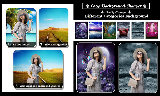 Easy Background Changer - Auto Cut Out (App Start) → Erase Photo Background ( By Cut Out Photo | Cut-Paste Image Editor Tool) → Transparent Image → Insert images with different HD background.
