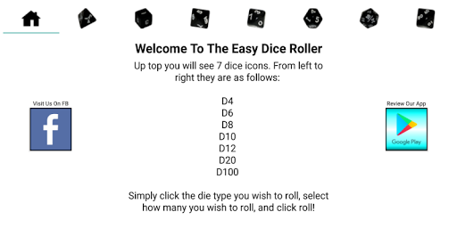 Easy Dice Roller was designed to be simple but effective. You can roll up to 10 of any of the following dice: