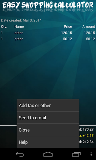 If you have a business, you can use Easy Shopping Calculator to cost out your job. Easy and convenient for when you're out in the field away from your computer. Even send bills and invoices via e-mail
