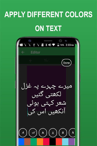 You can now write your favorite poetry on pictures and Images in Urdu Language. The simplest feature of Easy Urdu Keyboard app is the text editor. You can select from a variety of text fonts and place them on various backgrounds. You can write Urdu text from the Urdu keyboard and then apply text editor features such as change in color, font size, font style and so on to make sure that your text looks appropriate with the photo.
