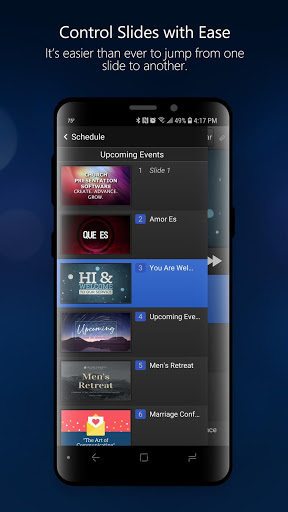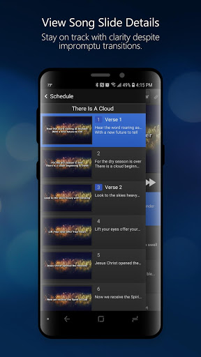 Remote Control - Control EasyWorship by selecting schedule items and going live. Select slides within a song or presentation, or tap the current slide preview to change to the next slide.