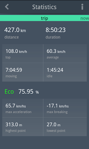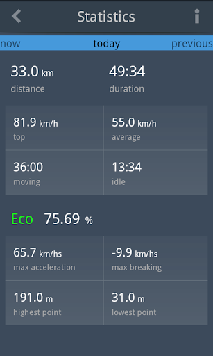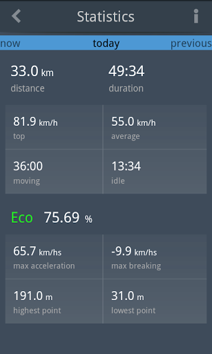 ● The motion efficiency indicator on the base of velocity, speedup and elevations analysis, permits you to correct your driving style and reduce fuel consumption in real time.